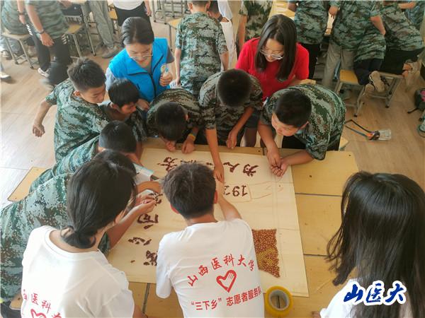 同时,队员们对困境家庭儿童与留守儿童进行免费体检、韦氏智力测试、心理健康评估,开展了爱党爱国教育、军训、课业辅导、消防安全健康教育等系列主题夏令营活动。通过绳结操作训练、豆子画体验等形式,丰富了留守儿童的暑期生活。孩子们在老师和队员们的带领之下,端正了学习态度,补足了精神之钙,增强了爱国情怀。