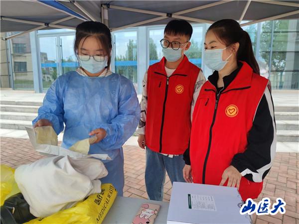与她们一样,中都、迎泽两校区的410名志愿者们在那一天,怀揣着对志愿者使命的共同追求,坚定地投入到这场并不简单的迎新活动中去。他们来自不同专业、不同年级,根据需要分成了行李转运组、就餐保障组和核酸检测组。在迎接新生的两天内,从早上七点到晚上十点,他们承担起查验防疫健康码,协助核酸采样、帮助新生搬运行李和协助食堂工作人员静默管理期间盒饭打包等多项工作。