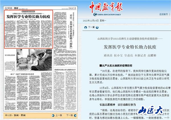 《中国教育报》要闻版头条专题报道我校师生发挥医学专业特长助力抗疫