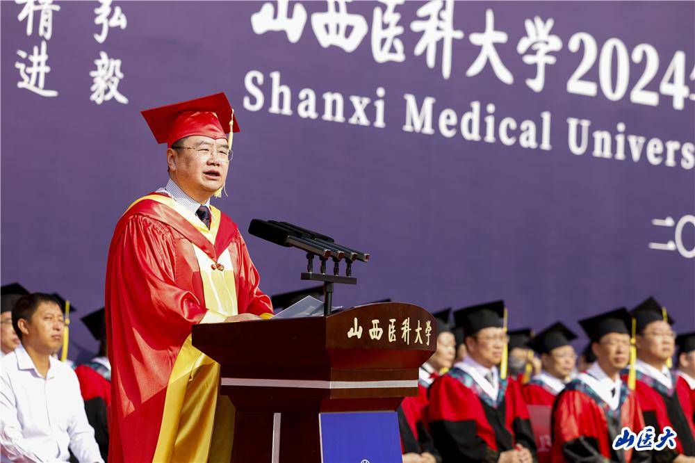 解军在致辞中带领全体毕业生一起回望学校历史,致敬一代代不负时代重托的山医青年。他指出,学校建立之初的山医人是奋斗的、热血的,他们在民族红色血脉的召唤中应运而生、坚毅笃行,红色是他们的青春底色;共和国成立后的山医人是质朴的、无私的,他们在国家重大战略指引下来到山西承担使命,为强国建设、民族复兴贡献力量,奉献是他们的青春底色;新时代的山医人是坚定的、担当的,肩负教育强国和健康中国建设重任,在中国式现代化的新征程上挺膺担当,奋斗是他们的青春底色。