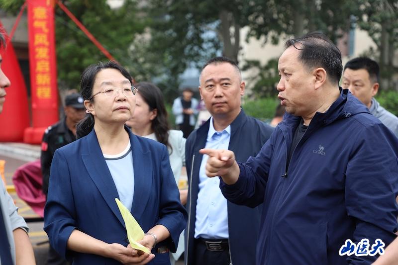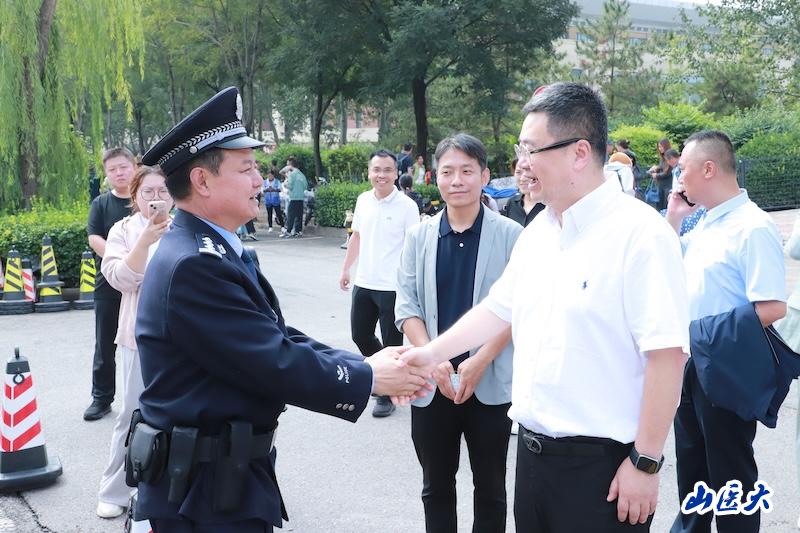 我校校长解军、校党委副书记彭月兰深入迎新现场,实地检查指导安全工作落实情况,亲切慰问了现场执勤的公安干警、交警,并代表学校向长期以来支持我校安全工作的公安机关表达了诚挚的感谢。