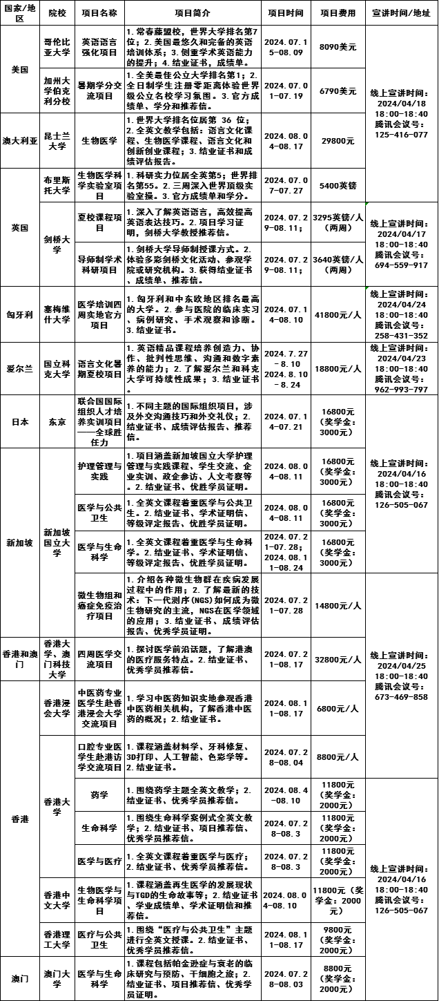 为鼓励品学兼优的学生积极参与国际交流,培养具有国际视野和跨文化交际能力的国际医学人才,我校在部分项目设立专项经费,资助学生出国(境)交流(详见宣讲会)。