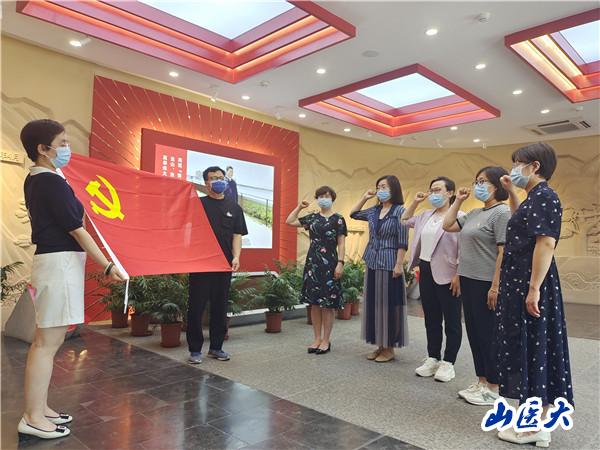 进入纪念馆,在鲜红的党旗下,全体党员郑重举起右拳,庄严宣誓,重温入党誓词。