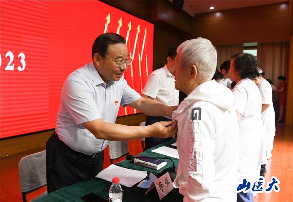今年,医院有9名老党员荣获“光荣在党50年”纪念奖章,李保为2名“光荣在党50年”的老党员代表颁发纪念奖章并献上鲜花,现场响起了热烈的掌声。