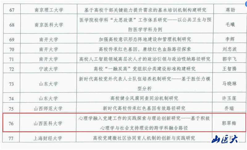 近日,全国党建研究会高校党建研究专业委员会公布了2025年课题立项结果。经专家评审与公示,全国260余所高校申报的1000余项课题中187项获批,包括重点课题34项(含一类10项、二类24项)和一般课题153项。我校护理学院学生第三党支部书记、明德润心辅导员工作室负责人郭翠梅主持申报的课题《心理学融入党建工作的实践探索与理论创新研究——基于积极心理学与社会支持理论的跨学科融合路径》获批立项,为我省高校本次获批的两项课题之一。