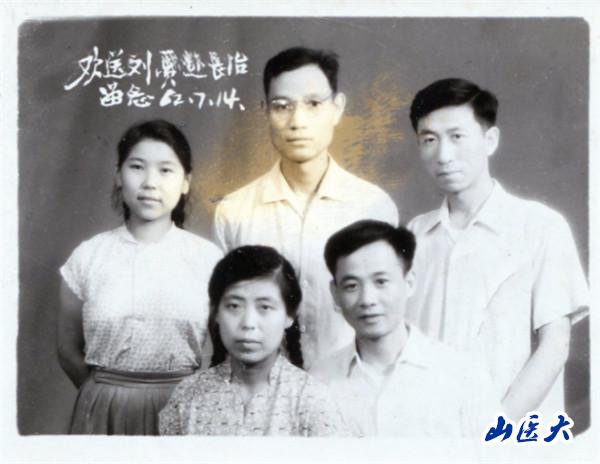 1962年7月14日,山西医学院第一附属医院皮肤科医生欢送刘纪尧同志及其爱人赴长治工作。图中:前排为刘纪尧(右一)及其爱人;后排左一为李月萍,曾为第一附属医院皮肤科医生;左二为郭再唐,曾任皮肤科主任;右一为叶培明,曾任皮肤科主任。