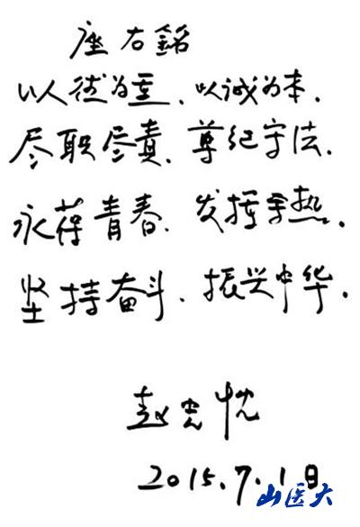 我行医50多年,从医疗、教学、科研这几方面作了总结,写下这32个字,表明自己对医学和工作的诚实,所以写下以德为重,以诚为本,以这种精神更好的工作,更好的为人民服务。现在虽然已退休,但是还要永葆青春,发挥余热,继续奋斗,为医学事业作出贡献。