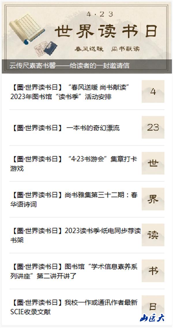 4月23日是第28个世界读书日。为充分发挥图书馆的文化传播和教育功能,营造良好的校园阅读文化氛围,图书馆以“春风送暖,尚书献读”为主题,开展了一系列形式多样、内容丰富的阅读推广活动。