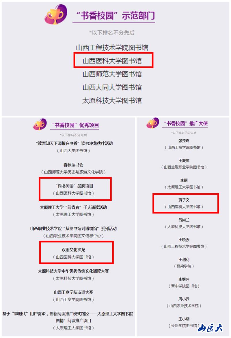 此次评选活动由山西省高等学校图书情报工作委员会主办,旨在贯彻习近平总书记致“首届全民阅读大会”贺信及党的二十大报告关于“深化全民阅读活动”的要求,落实教育部等八部门印发的《全国青少年学生读书行动实施方案》,进一步推动山西省高等院校阅读文化和书香校园建设,引导师生形成爱读书、读好书、善读书的良好阅读习惯。全省共收集到94件申报材料,经过专业评审,最终评定5个“书香校园”示范部门、9个“书香校园”优秀项目以及10位“书香校园”推广大使。我校图书馆获评“书香校园”示范部门;图书馆“尚书阅读”品牌项目、双语文化沙龙获评“书香校园”优秀项目;青年教师贾子文获评“书香校园”推广大使。