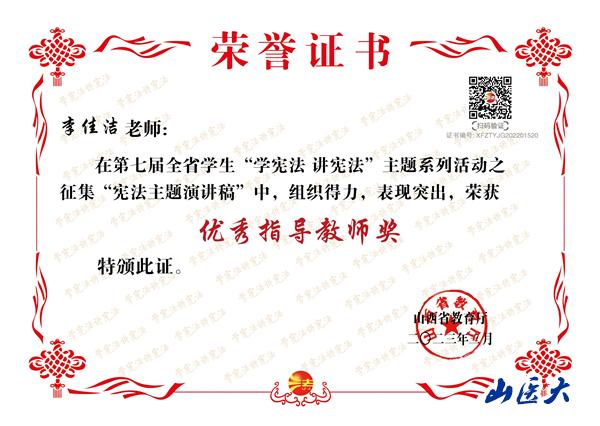 “学宪法讲宪法”主题系列活动是山西省教育厅每年组织的一项重要普法活动,也是我校面向广大师生进行法律宣传的主要活动内容。近日,山西省教育厅公布了在2022年全省教育系统的“学宪法、讲宪法”活动中表现突出的先进集体和个人,我校荣获优秀组织奖,基础医学院学生白京与指导老师李佳洁分获三等奖与优秀指导教师奖;护理学院学生张玲辉获宪法知识竞赛决赛优秀奖;另外,在“我与宪法”微视频活动中,第一临床医学院学生贾志杰、廖晴雪,儿科医学系学生杜娟、任若瑜分获优秀奖。