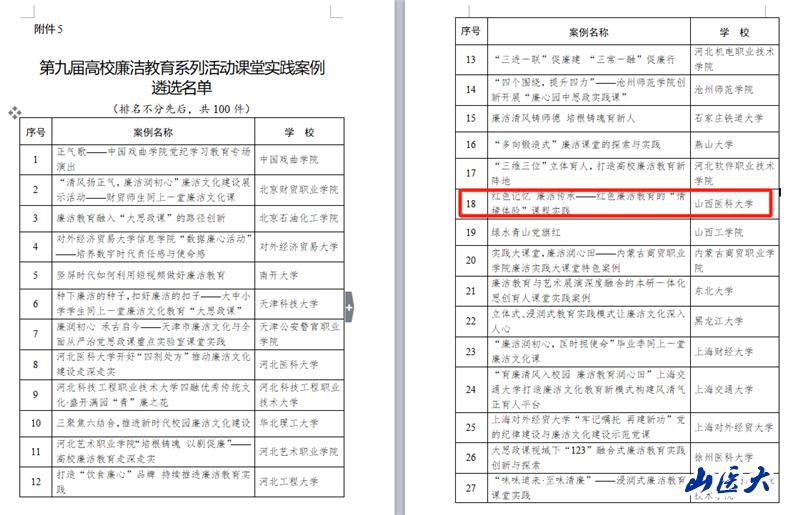 11月5日,教育部发布《关于第九届高校廉洁教育系列活动结果的公示》。经省教育厅推荐,教育部组织专家遴选,山西省共有7所高校报送的9个项目进入遴选名单。其中,由我校党委宣传部、马克思主义学院牵头报送的两个项目入选,入选项目数位居全省高校之首。其中,“红色记忆 廉洁传承”入选“一校一金句”网络微课遴选名单,“红色记忆 廉洁传承——红色廉洁教育的‘情境体验’课程实践”入选课堂实践案例遴选名单。入选项目将在央视网、中国大学生在线、中国教育发布等平台进行展播。