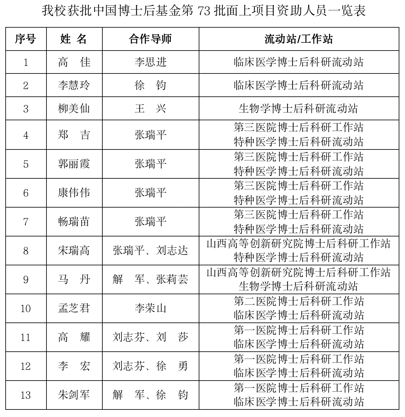 近日,中国博士后科学基金会公布了第73批面上资助拟资助人员名单,我省共有27位博士后研究人员进入公示,其中我校13位在站博士后(含联合招收)获得资助,获批数量再创新高。截至目前,我校培养博士后已获批65项中国博士后科学基金资助,近五年获批总数稳居全省第一。
