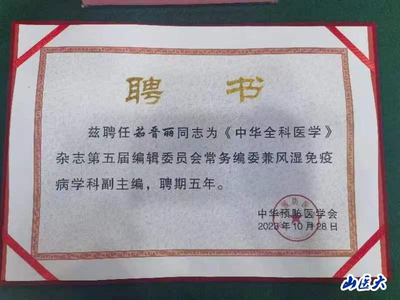 我校第二医院全科医学科茹晋丽主任当选为《中华全科医学》常务编委及风湿免疫病学科副主编