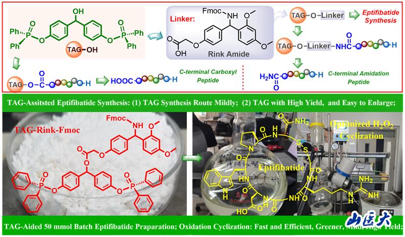 同期,梁泰刚团队在期刊Sustainable Chemistry and Pharmacy (中科院二区,2023年影响因子5.5)发表了“Scalable Preparation of Green C-terminal Amidation Peptide-Synthesis TAGs and the Optimized TAG-Assisted Liquid-Phase Synthesis of Eptifibatide”研究论文。