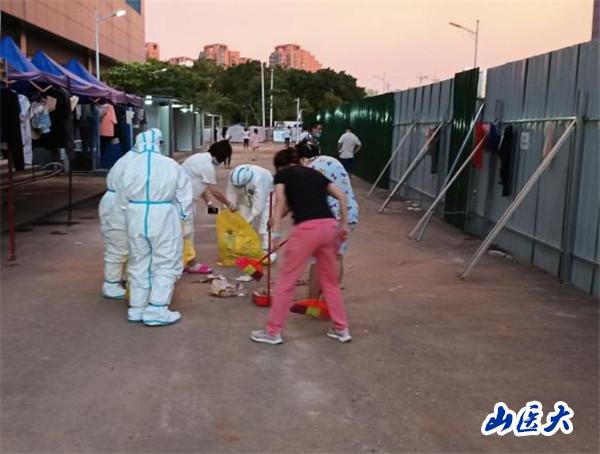 队员们来自不同科室,但很快建立起默契,组长也根据队员的特点与专长进行了分工,使得小组内每一项工作得以顺利高效完成。我们还同时承担舱内的保洁工作,几十个卫生间逐一进行清扫、消毒,一圈下来汗水在防护服里直流,但看着整理后的卫生间整洁干净还是有满满的成就感,也忘却了疲惫。