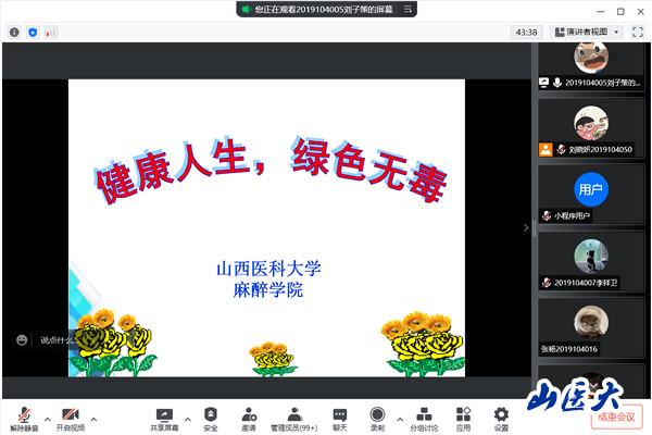 组织一次禁毒主题班会。全体本科生以年级为单位,在腾讯会议线上开展“大学生毒品预防安全教育”主题班会。主题班会主要讲述了毒品的定义、危害和对吸毒行为的正确认识,以及如何提高拒绝毒品的心理防御能力和自觉性,培养自觉与涉毒违法犯罪行为作斗争的意识。