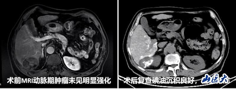 手术过程中,在CBCT的实时引导下,团队精准锁定患者肿瘤的三支供血动脉,并利用微导管逐一超选至目标血管,顺利完成化疗栓塞。栓塞后造影显示肿瘤血管完全消失,病灶碘油沉积良好。术后一周复查CT,碘油沉积范围与PET/CT提示的活性病灶范围完全一致,治疗效果明显。