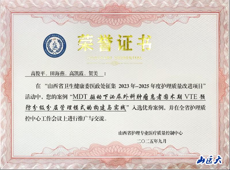 由高俊平带领的泌尿外科护理团队,聚焦泌尿外科肿瘤患者围术期静脉血栓栓塞症(VTE)的防控难题,创新建立“MDT驱动下分级分层管理模式”。该模式打破学科界限,整合外科、麻醉、药学、康复、营养等多学科资源,依据患者不同风险等级实施个性化防控策略,实现了VTE防治的精准化与全流程管理,为复杂肿瘤患者围术期安全提供坚实保障,其创新理念和实用成效为全省医疗机构提供了可复制、可推广的实践范本。