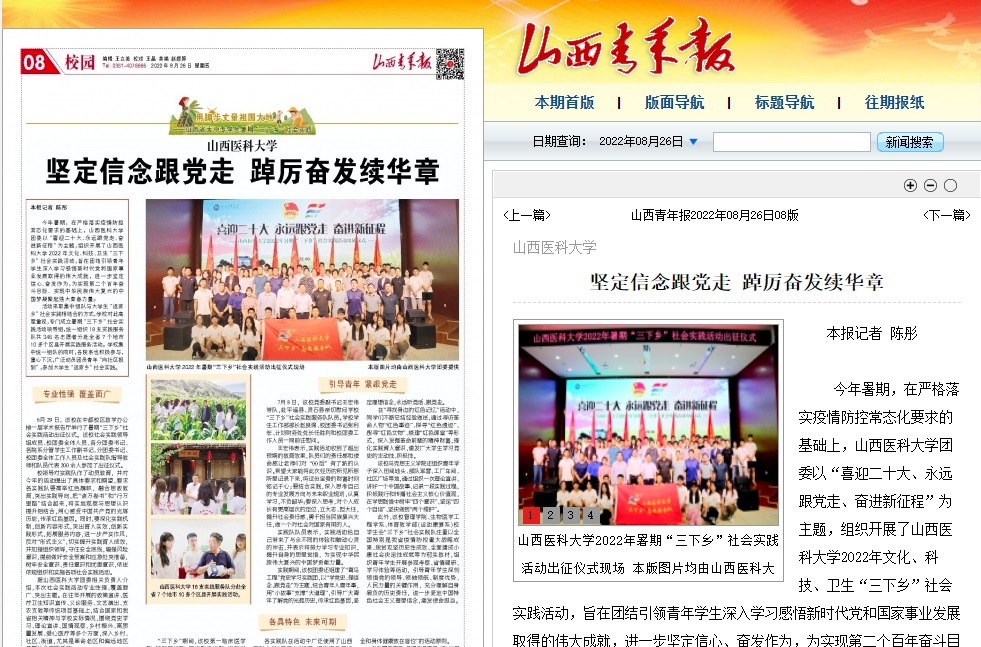 记者了解到,该校历来重视“三下乡”社会实践活动,自1990年开始,该校“三下乡”社会实践活动已开展了32年,取得了实践育人、支医、支教和学校宣传的多项丰硕成果。如今,有越来越多的大学生从“三下乡”社会实践活动中收获了宝贵的社会实践经验,磨练了意志,锻炼了才干,增长了见识,在未来的人生中不断创造新的精彩,山医学子在红色党旗的感召下,以昂扬的斗志、饱满的热情、奋进的姿态,坚定信念跟党走,踔厉奋发续华章。