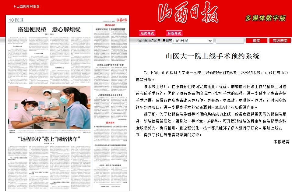 山西日报︱山医大一院上线手术预约系统