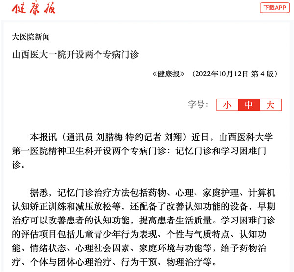 据悉,记忆门诊治疗方法包括药物、心理、家庭护理、计算机认知矫正训练和减压放松等,还配备了改善认知功能的设备,早期治疗可以改善患者的认知功能,提高患者生活质量。学习困难门诊的评估项目包括儿童青少年行为表现、个性与气质特点、认知功能、情绪状态、心理社会因素、家庭环境与功能等,给予药物治疗、个体与团体心理治疗、行为干预、物理治疗等。