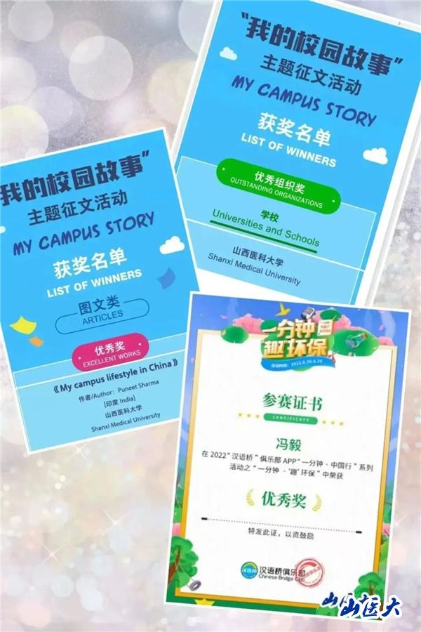 留学生首次参加山西省“互联网+”大学生创新创业大赛获铜奖;参加省委宣传部、省教育厅、省文物局联合开展的“留学生讲中国青铜故事”及山西省人民对外友好协会主办、晋中市人民政府外事办公室协办的“智慧生活”文化实践活动。3名学生分获教育部、中国-东盟教育交流周、中国日报社主办的活动奖项,我校两次获“优秀组织奖”。