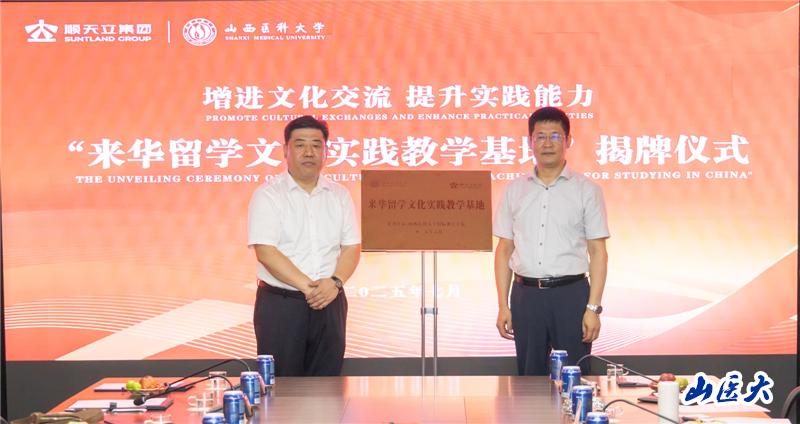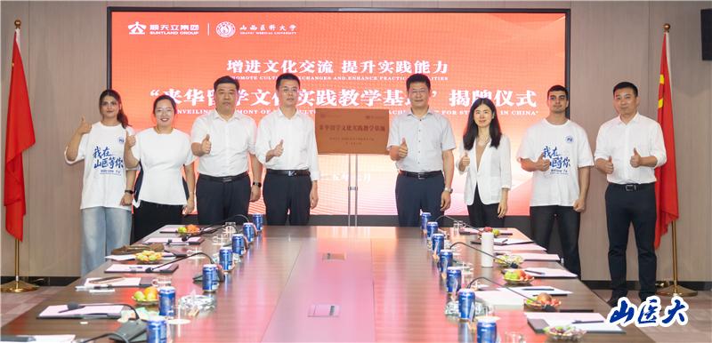 7 月 9 日,我校与山西顺天立大健康产业集团有限公司共建的“来华留学文化实践教学基地”举行揭牌仪式。我校国际教育学院党总支书记郭亚斌、副院长于晓霞及部分师生代表共同参加活动,山西顺天立大健康产业集团有限公司董事长胡瑾瑜、太原市人民对外友好协会专职副会长杨永生出席。
