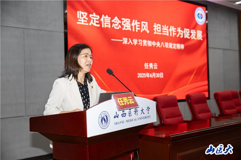 任秀云围绕“开展深入贯彻中央八项规定精神学习教育的重要意义”“医疗领域易发问题和风险点警示”“以优良作风推动医院事业高质量发展”三个方面进行了系统讲述。她表示,作风建设是一场攻坚战、持久战。在全面从严治党新起点上,通过开展深入贯彻中央八项规定精神学习教育,进一步密切党群干群关系、巩固党的执政基础,至关重要。开展深入贯彻中央八项规定精神学习教育的成效主要体现在为人民群众办实事、解难题上。要通过学习教育,从思想根源上纠治脱离群众的不良风气,重塑党员干部艰苦奋斗的作风。她激励大家锚定口腔医学院2025年8大重点工作,迎难而上、攻坚克难,以“钉钉子”精神将学习成效转化为推动口腔医学院各项工作高质量发展的强大动力。